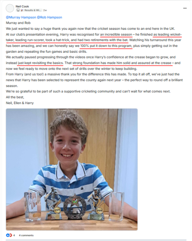 "Harry finished as leading wicket-taker, leading run-scorer... Watching his turnaround this year has been amazing, and we can honestly say we 100% put it down to this program, plus simply getting out in the garden and repeating the fun games and basic drills."